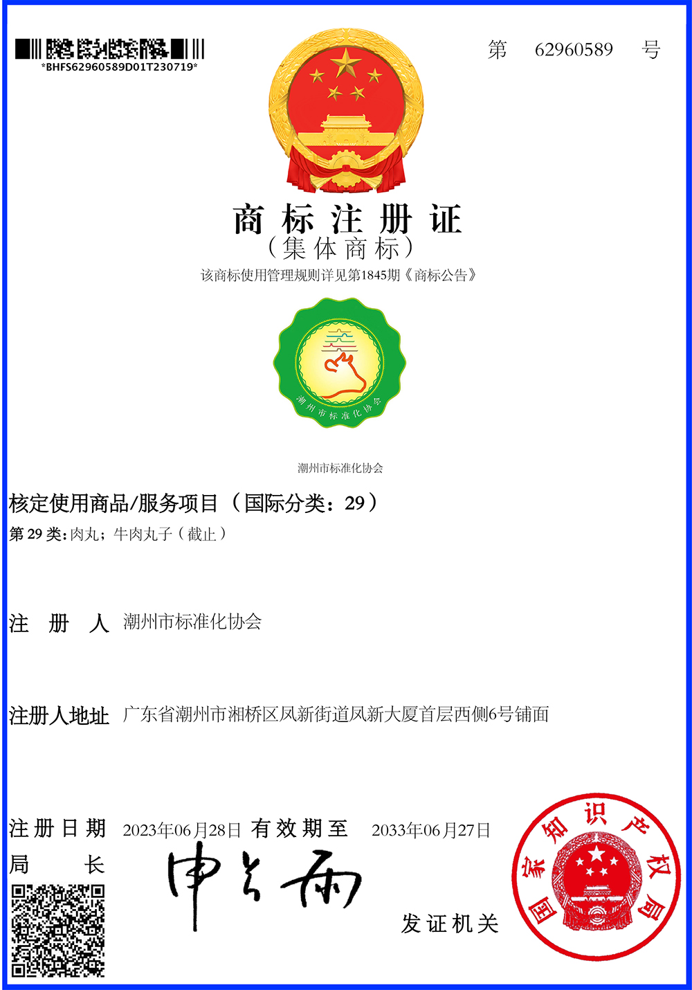 潮州市标准化协会申请注册的集体商标,已于2023年6月28日通过国家知识产权局的核准注册。从此,市标协拥有自己的首个集体商标。