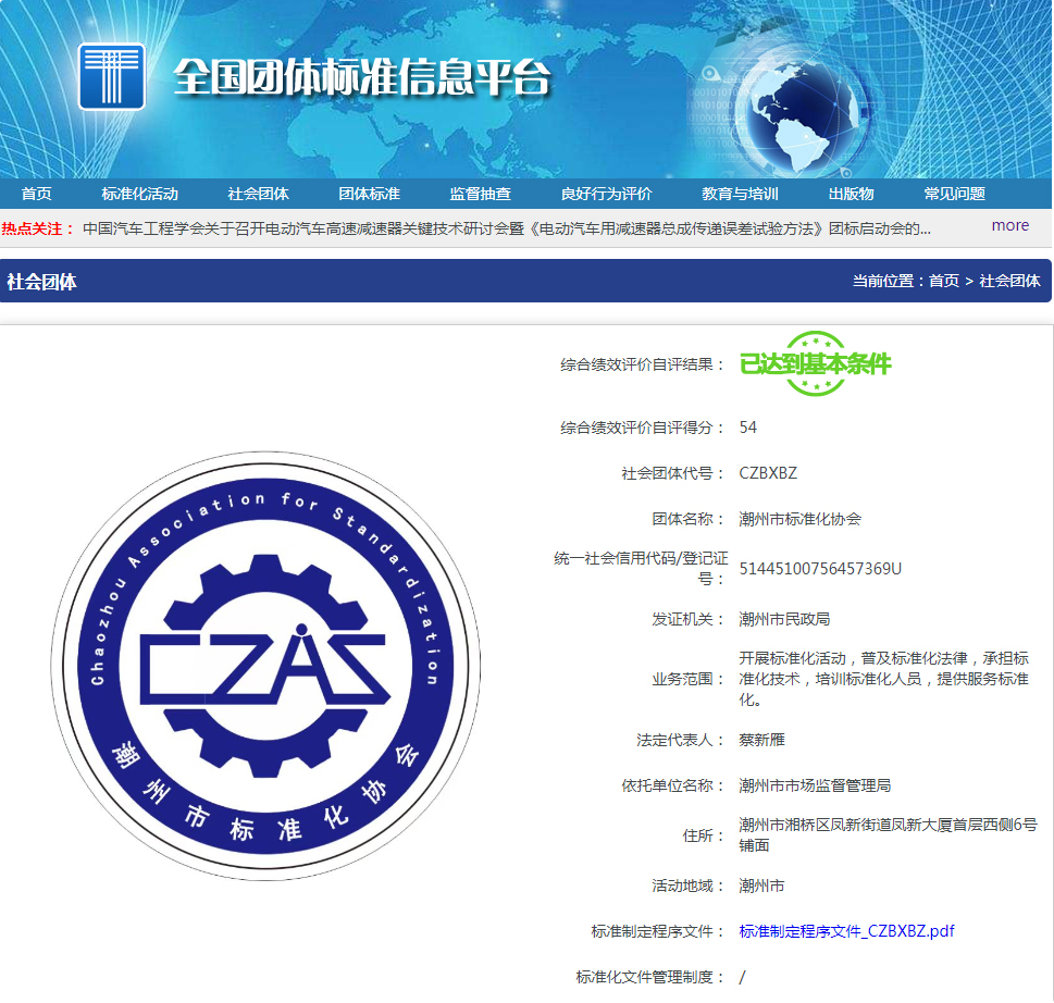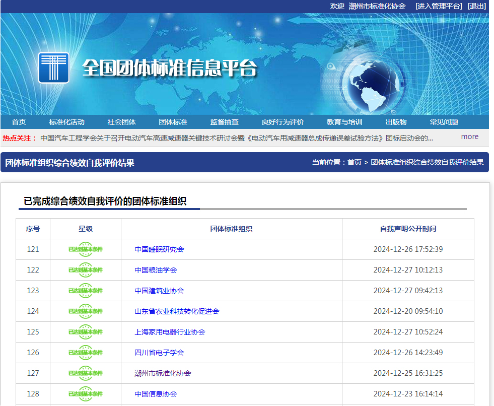 本月25日,潮州市标准化协会通过全国团体标准信息平台,按时完成《团体标准组织综合绩效评价指标体系》自我评价。