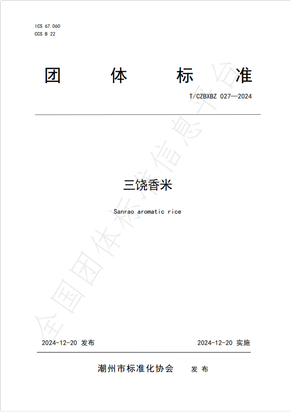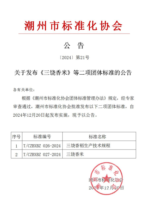 根据《潮州市标准化协会团体标准管理办法》,潮州市标准化协会批准发布由潮州市标准化协会主导制定的《三饶香米》(T/CZBX BZ 027—2024)团体标准,该标准于2024年12月20日发布,2024年12月20日实施。现予以公告。